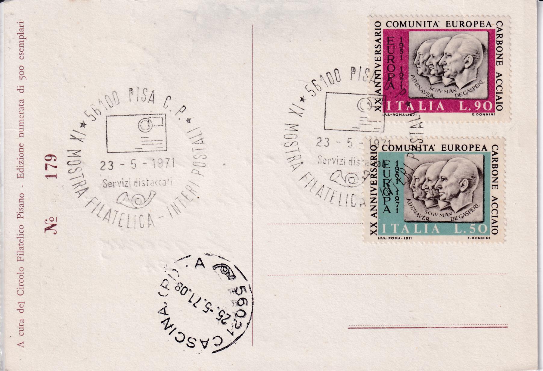 Cartolina IX Mostra Filatelica Pisana Interi Postali affrancata con 2 francobolli Serie Ventennale della CECA Lire 50 e Lire 90 (cat. n. 1145 e 1146) con Annullo Speciale 23-5-1971 IX Mostra Filatelica Pisana Interi Postali Pisa 22-23 maggio 1971