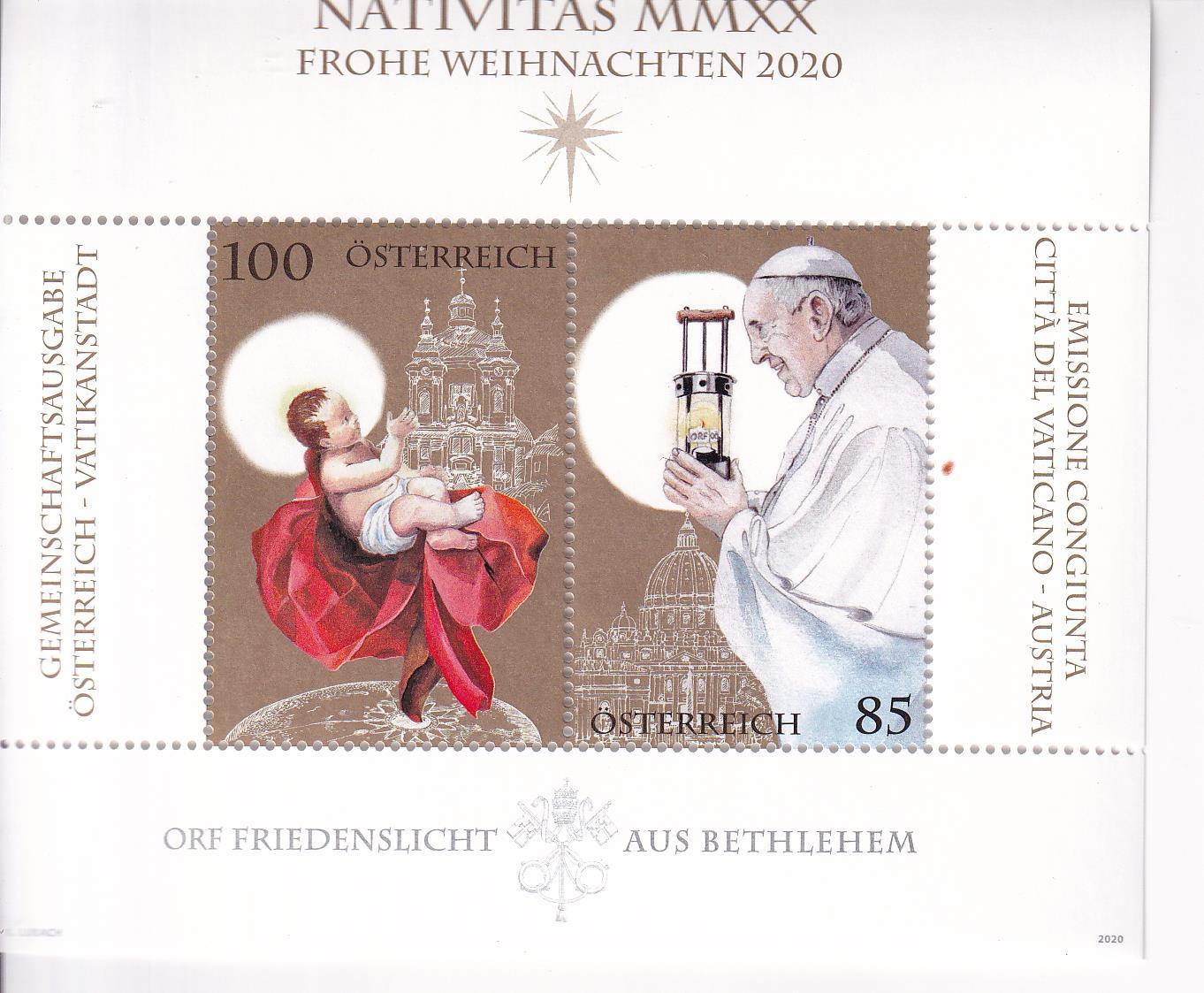 Foglietto Vaticano, Anno 2020, Natale. Emissione congiunta con l’Austria (BF n. 105) con il corrispondente Foglietto emesso dall’Austria
