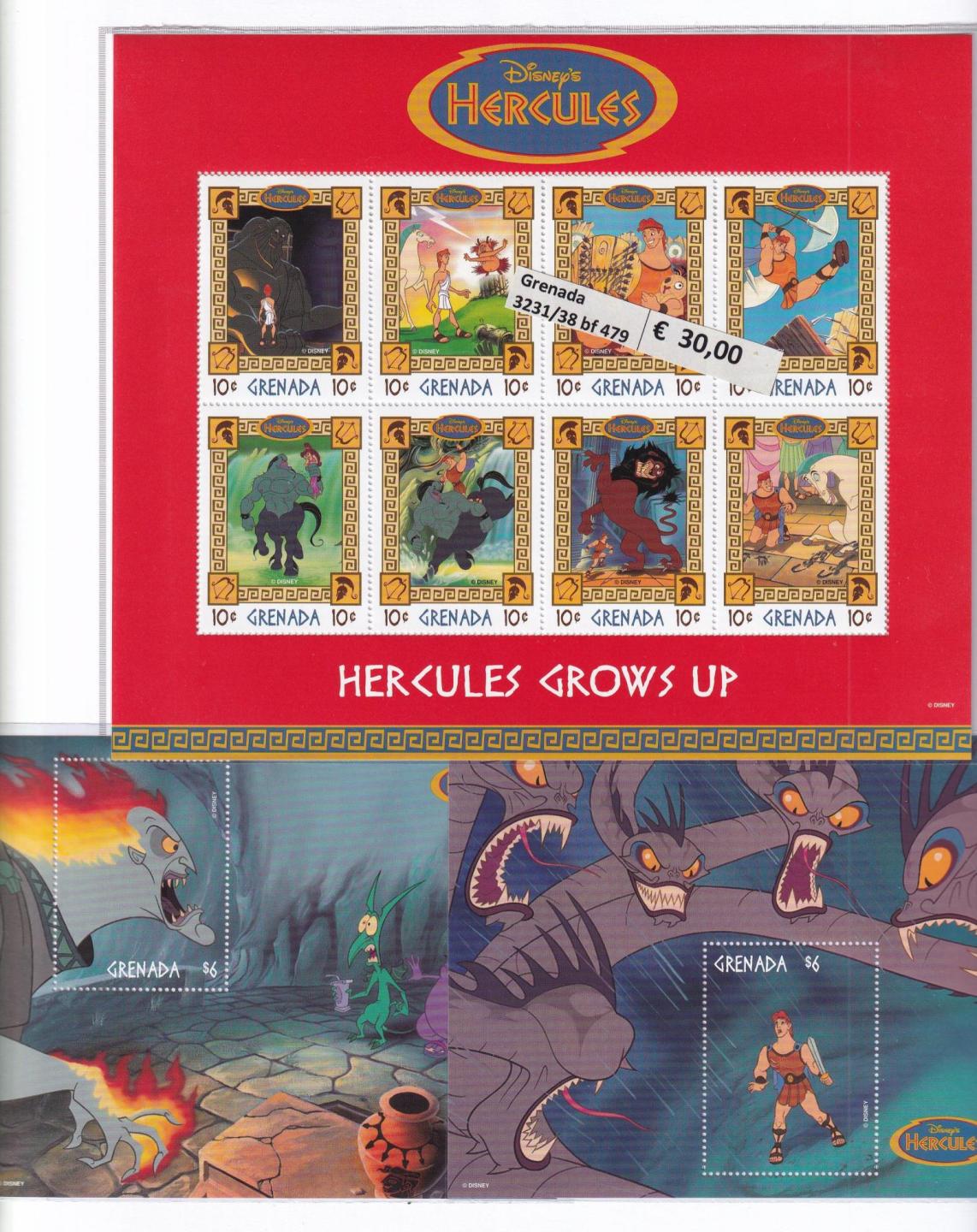 Francobolli e Foglietti Granada, Tematica Disney, Anno 1998, Hercules (cat. n. 3223-3230, n. 3231-3238, BF n. a77-478-479-480)