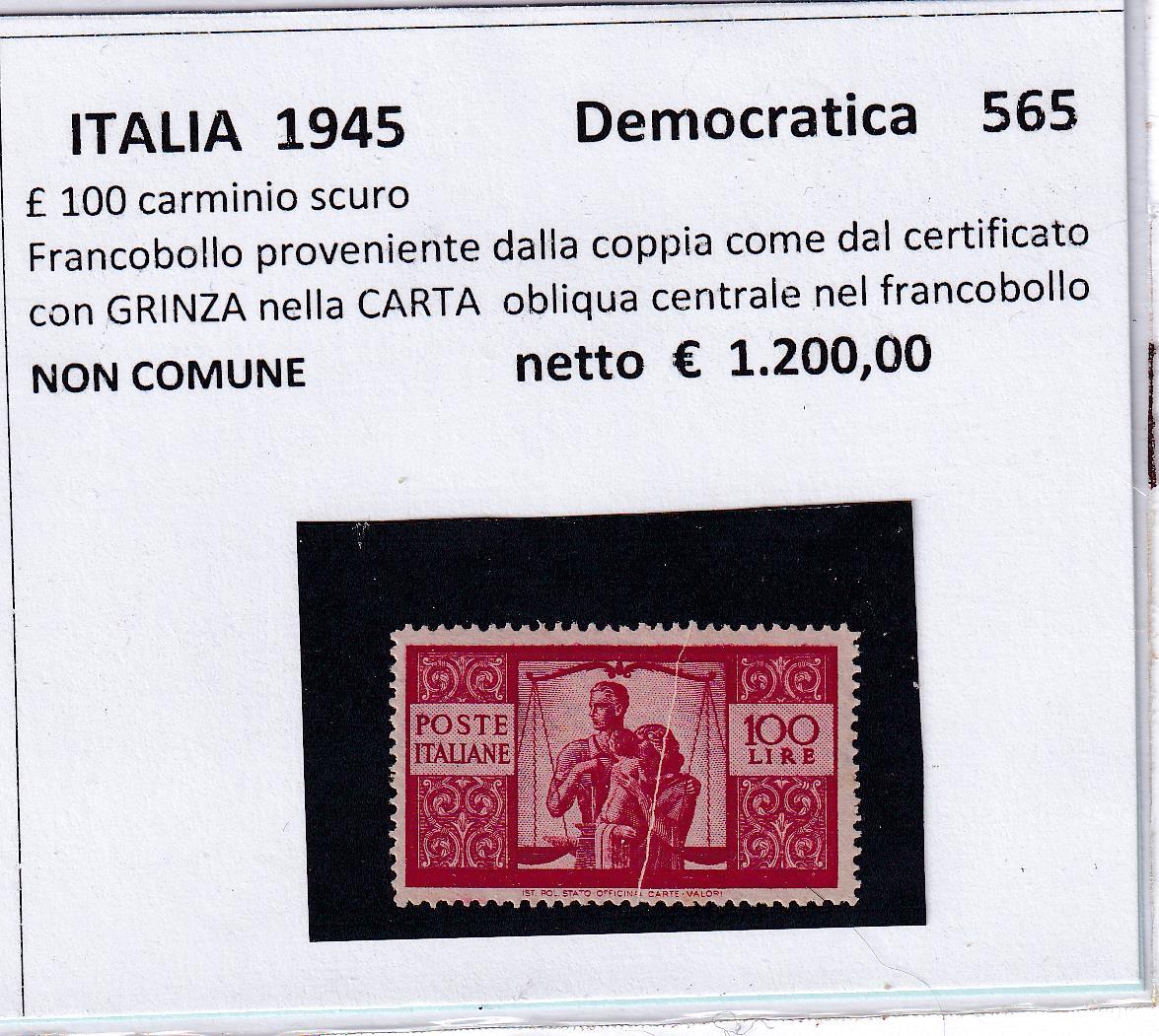 Francobollo Italia Repubblica Anno 1945 Serie Democratica Lire 100 carminio (cat. n. 565) VARIETA’ con Certificato