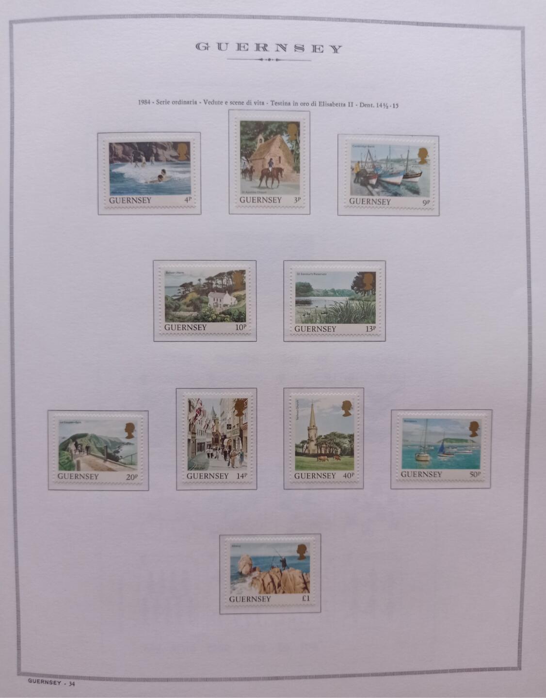 Francobolli Guernsey Anno 1984 Annata completa montata su Fogli Marini King usati (i fogli sono in omaggio)