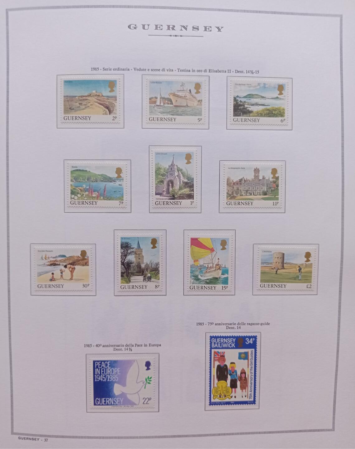 Francobolli Guernsey Anno 1985 Annata completa montata su Fogli Marini King usati (i fogli sono in omaggio)