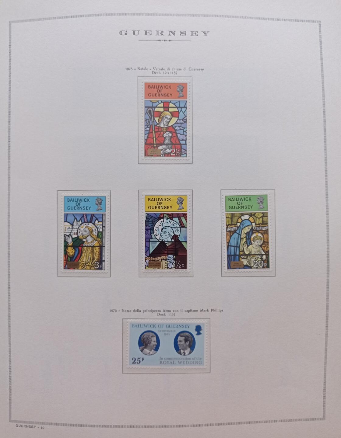 Francobolli Guernsey Anno 1973 Annata completa montata su Fogli Marini King usati (i fogli sono in omaggio)