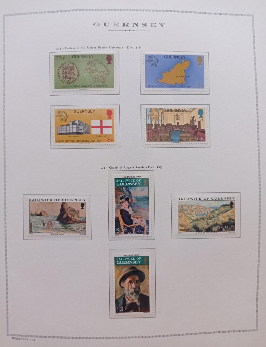 Francobolli Guernsey Anno 1974 Annata completa montata su Fogli Marini King usati (i fogli sono in omaggio)