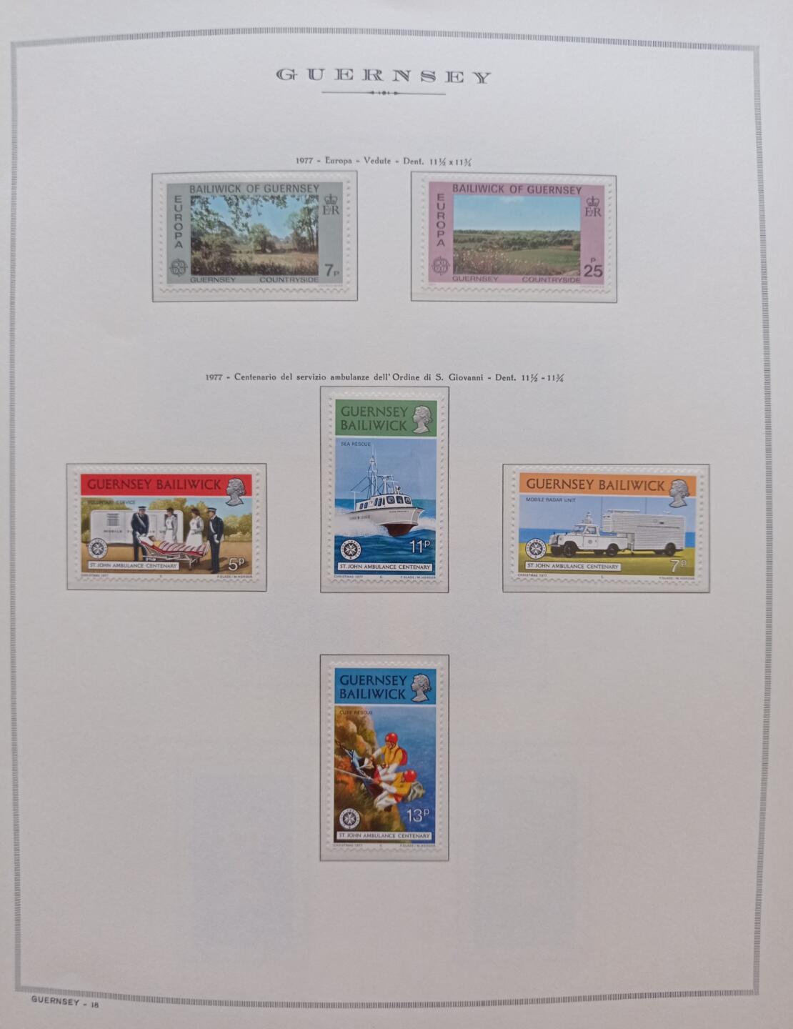 Francobolli Guernsey Anno 1977 Annata completa montata su Fogli Marini King usati (i fogli sono in omaggio)