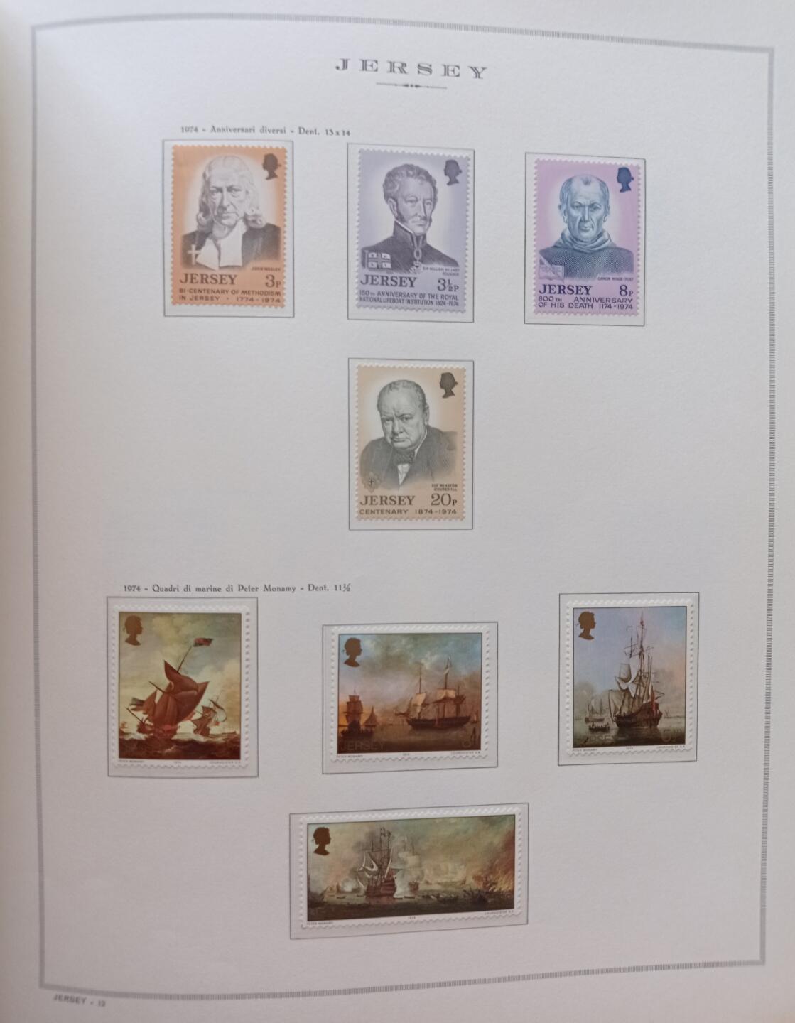 Francobolli Jersey Anno 1974 Annata completa montata su Fogli Marini King usati (i fogli sono in omaggio)