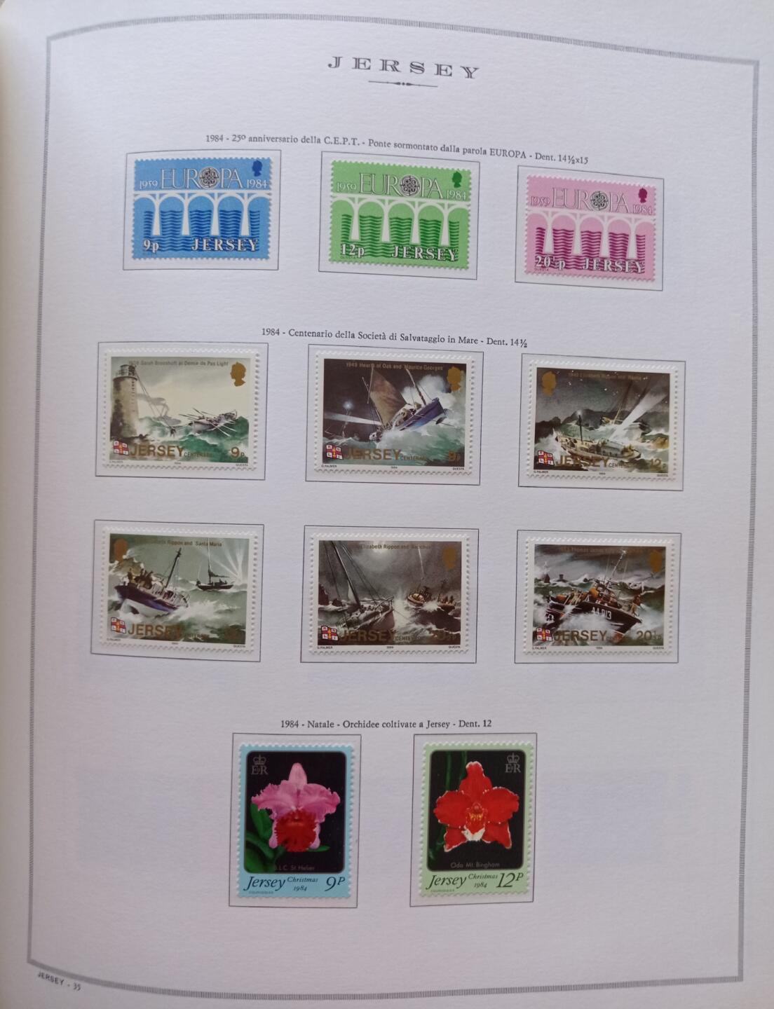 Francobolli Jersey Anno 1984 Annata completa montata su Fogli Marini King usati (i fogli sono in omaggio)