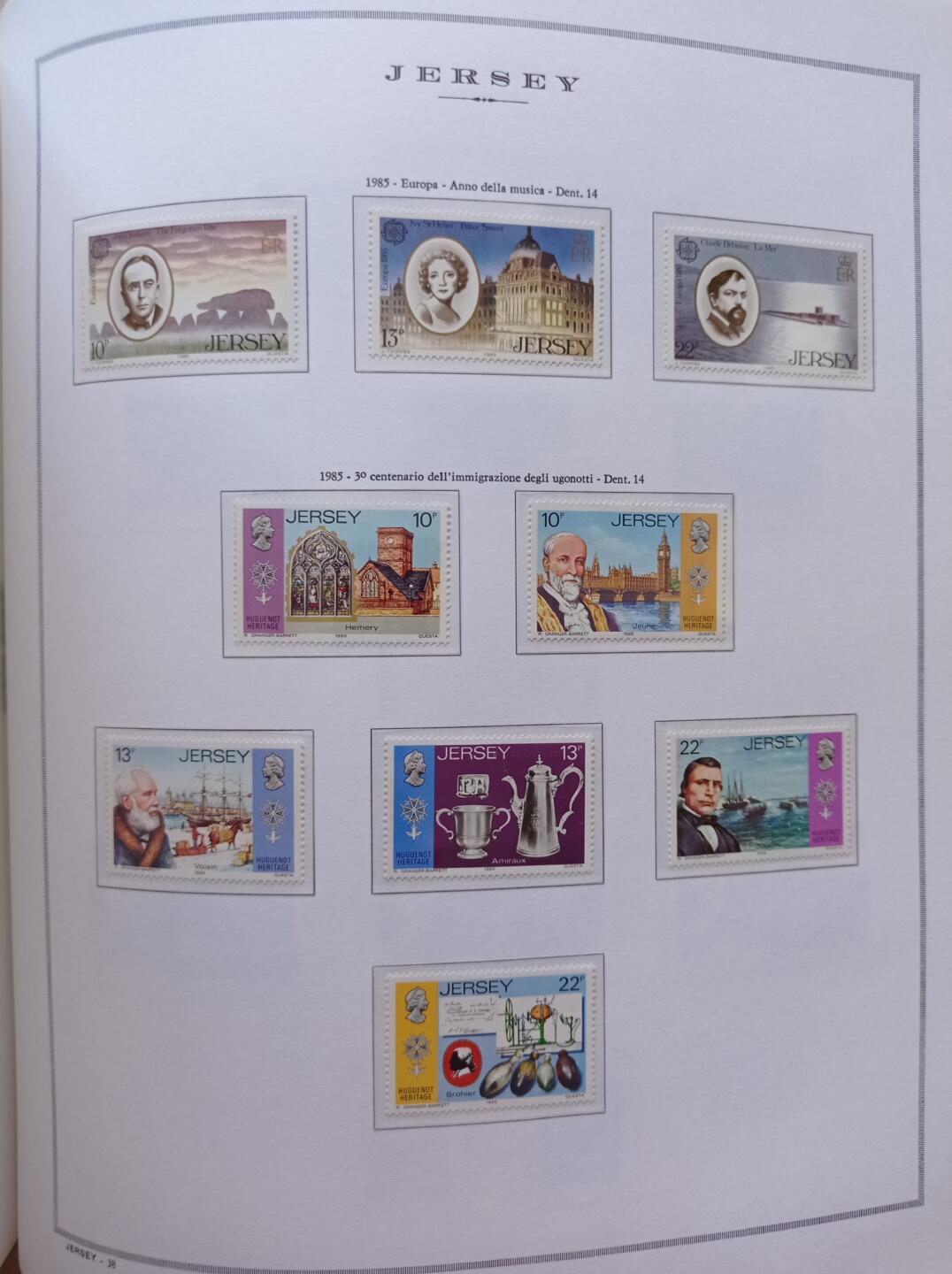 Francobolli Jersey Anno 1985 Annata completa montata su Fogli Marini King usati (i fogli sono in omaggio)