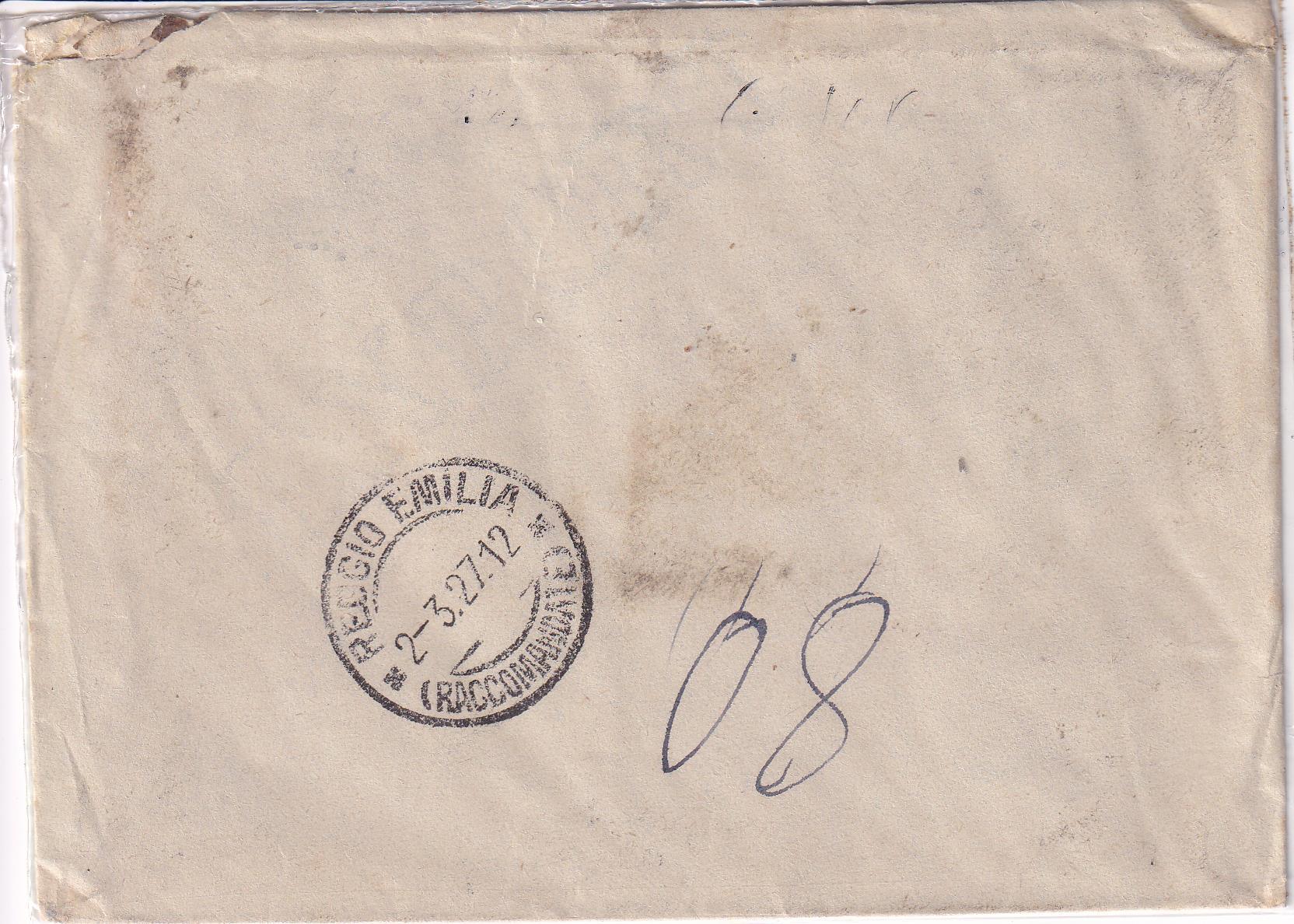 Storia postale. Raccomandata espresso da Busana 1839 del 02/03/1927 a Reggio Emilia 06/12/27