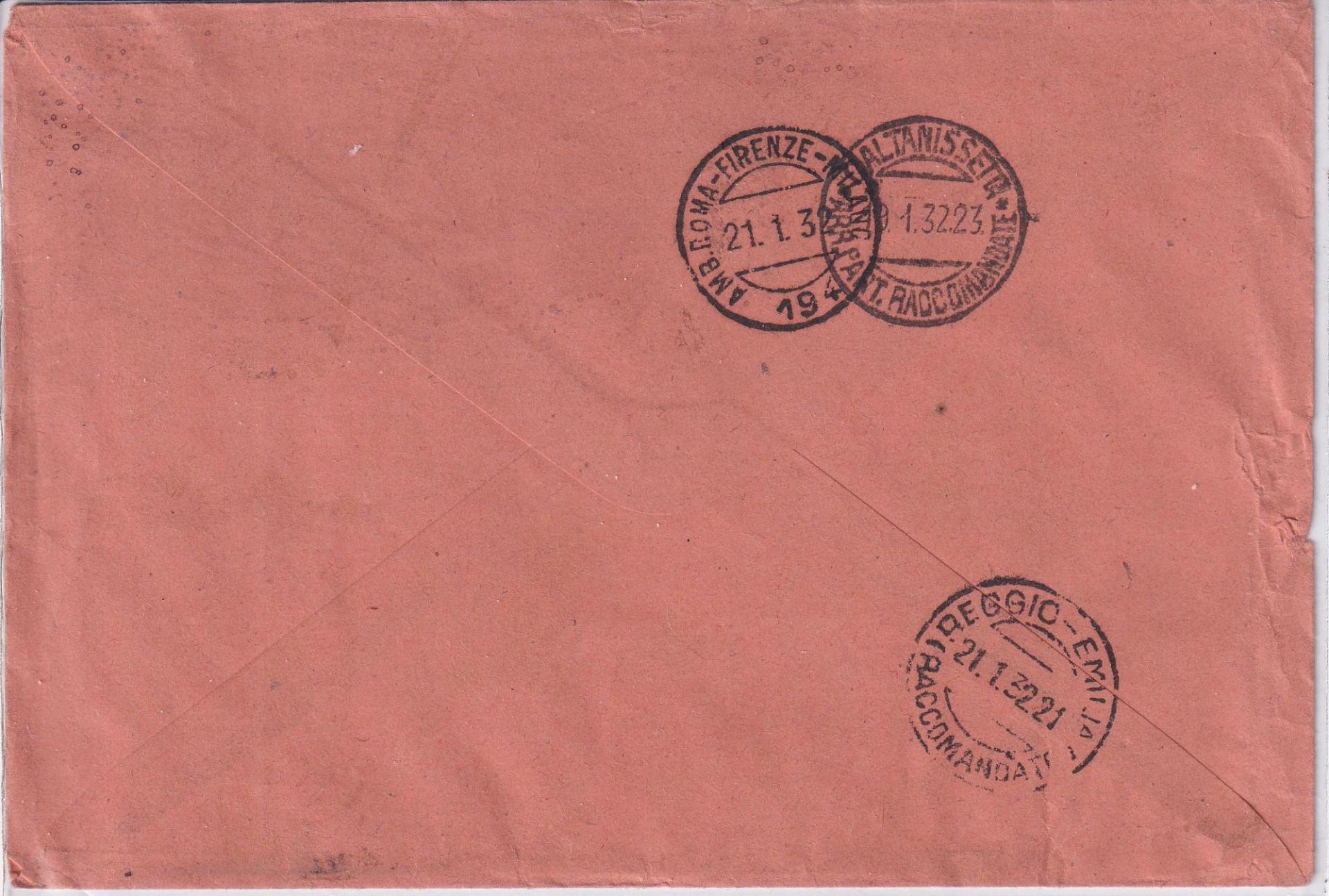 Storia postale. Raccomandata Espresso da Gela R 1323 del 19/01/1932 a Reggio Emilia 21/0/1932