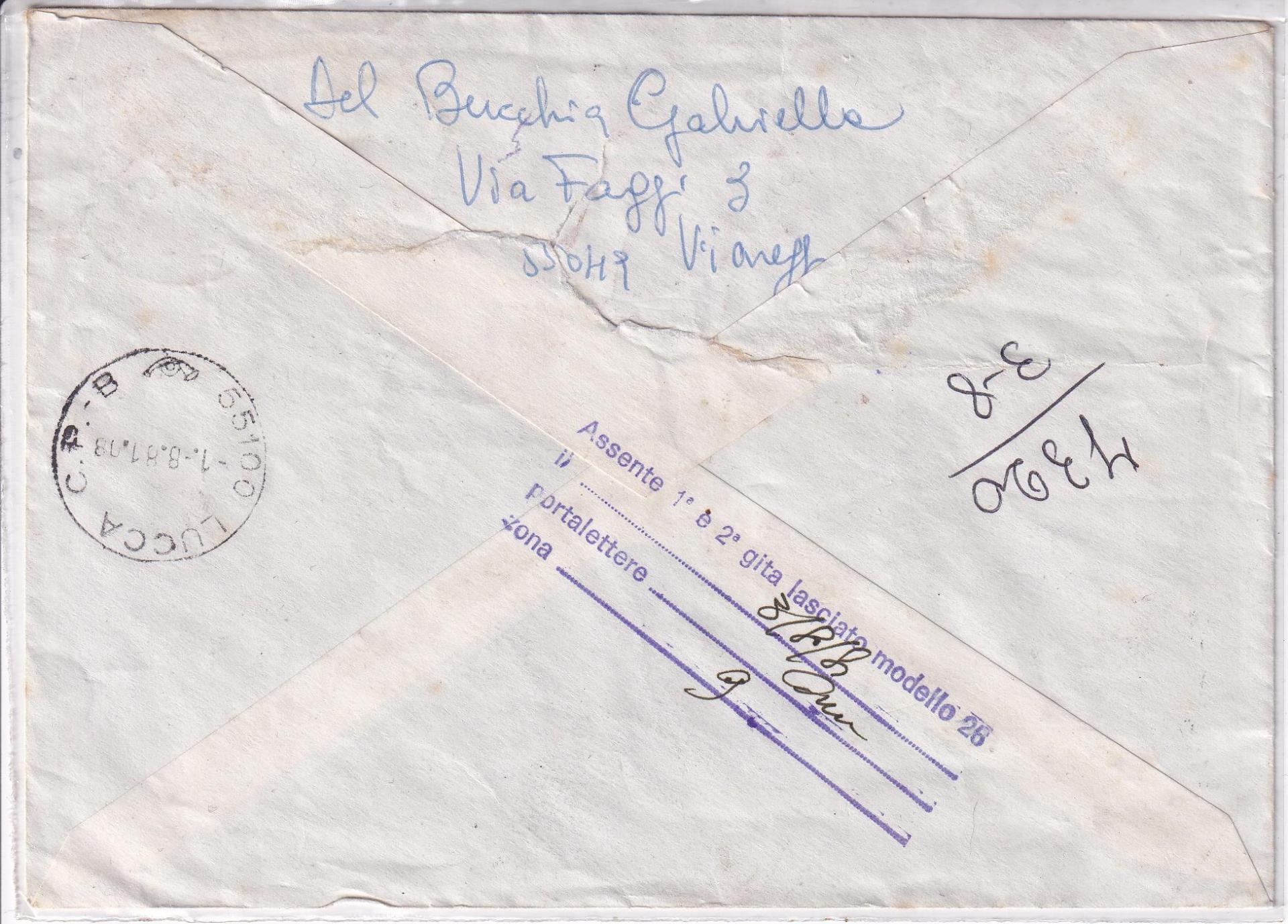 Storia postale. Raccomandata da Viareggio R 3799 31/07/1981 Lucca 01/07/1981