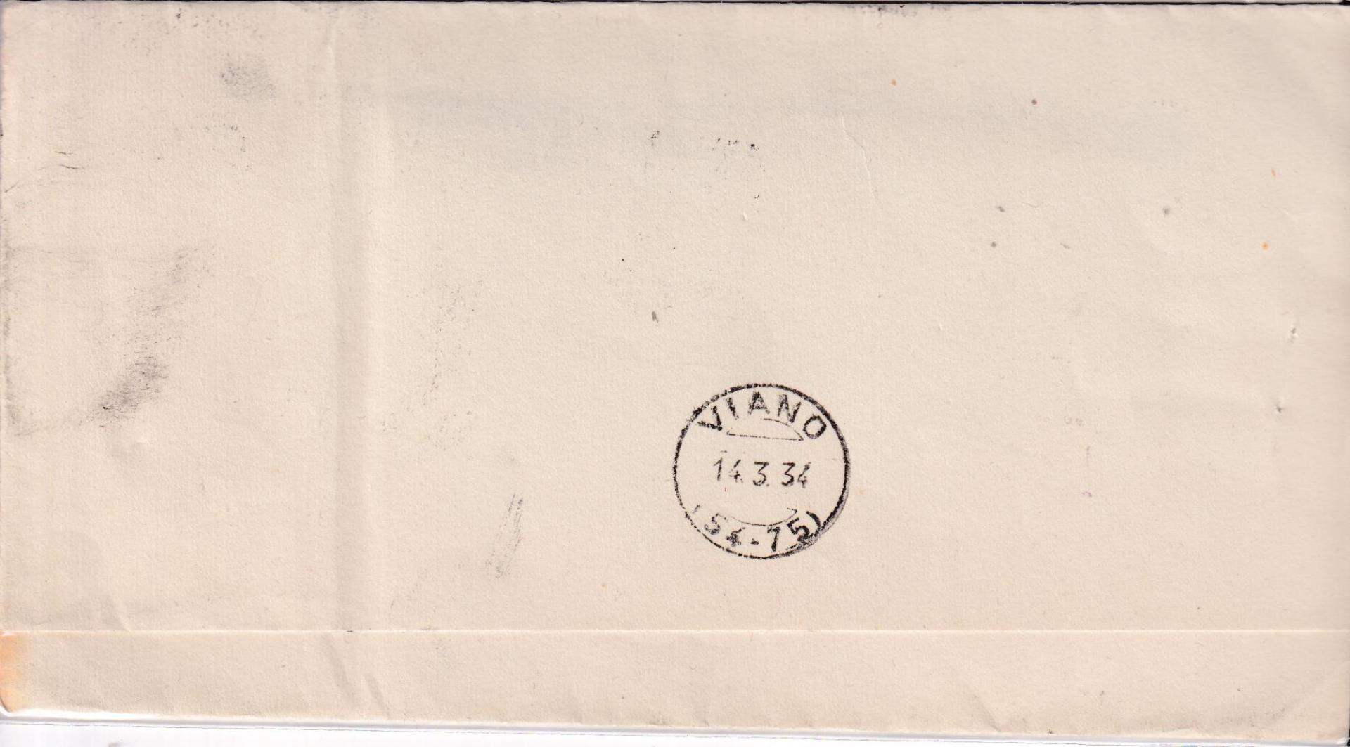 Storia postale. Raccomandata R. R. da Reggio Emilia 665 del 13/03/1934 a Viano 14/3/1934