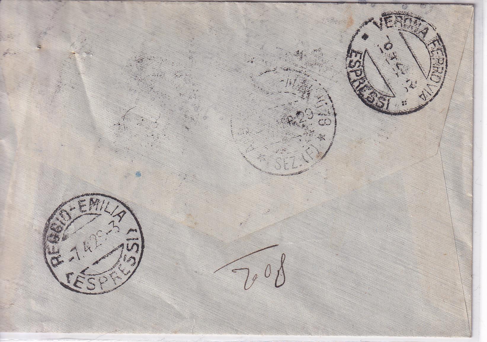 Storia postale. Espresso da Verona 06/04/1929 a Reggio Emilia 07/04/1929