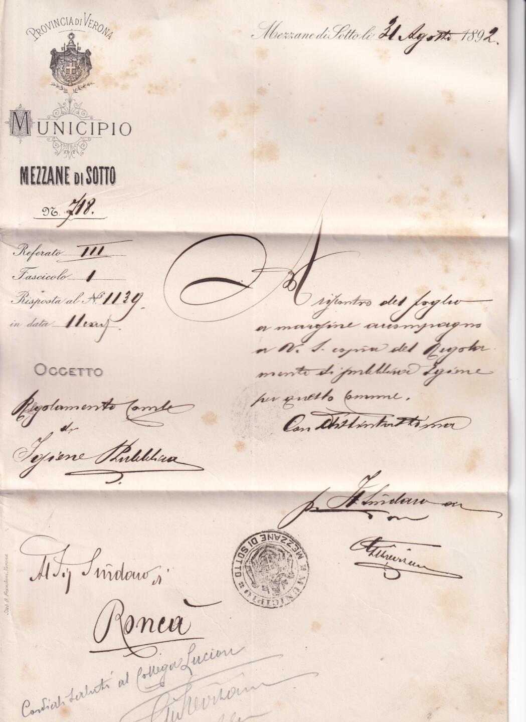 Storia postale Circolare da Municipio Mezzane di Sotto (Timbro Municipio Mezzane di Sotto con stemma) 31/08/1892 all’On Sig. Sindaco di Roncà 05-06/09/1892