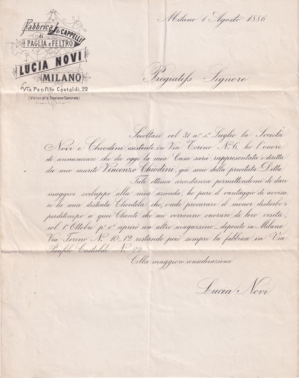 Storia postale Circolare da Ditta LUCIA NOVI CAPPELLI Paglia e Feltro Milano 24/08/1886 a Wohlen (Svizzera) 25/08/1886