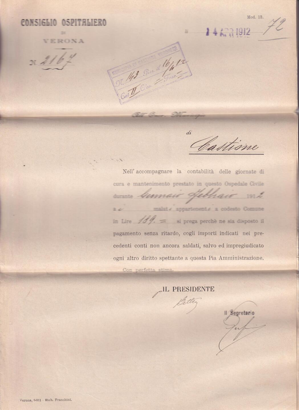 Storia postale Circolare da Consiglio Ospitaliero di Verona n. 2167 del 15/04/1912 a Castione (Verona)