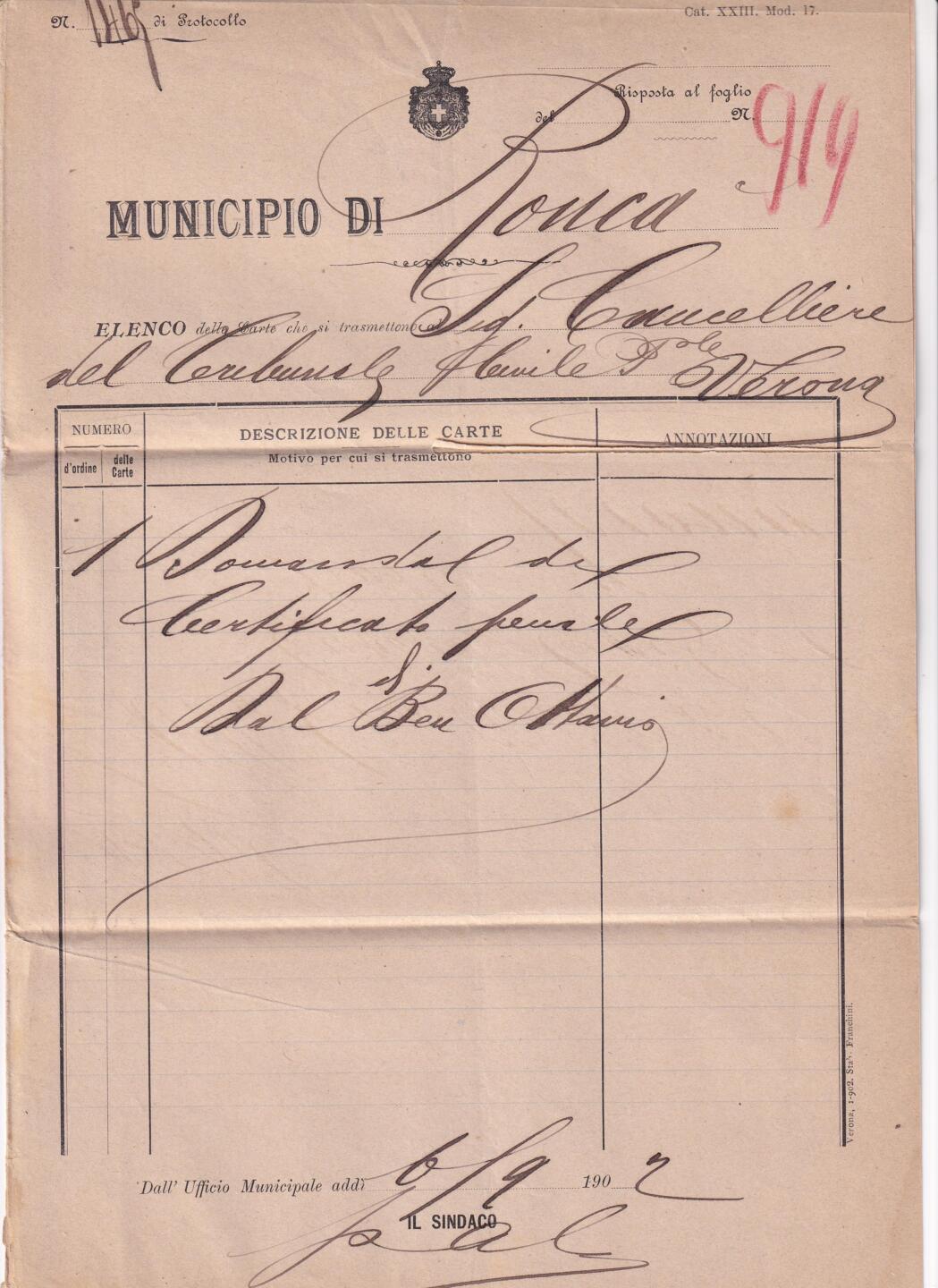 Storia postale Circolare da Municipio Roncà (Timbro: R. Poste Sindaco del Comune di Roncà) 06/09/1902 alla Cancelleria del Tribunale Civile e Penale di Verona