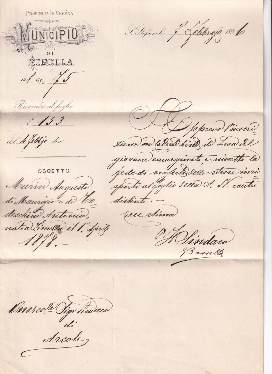 Storia postale Circolare da Municipio di Zimella 4-7 febbraio 1896 all’Onorevole Sign. Sindaco di Arcole
