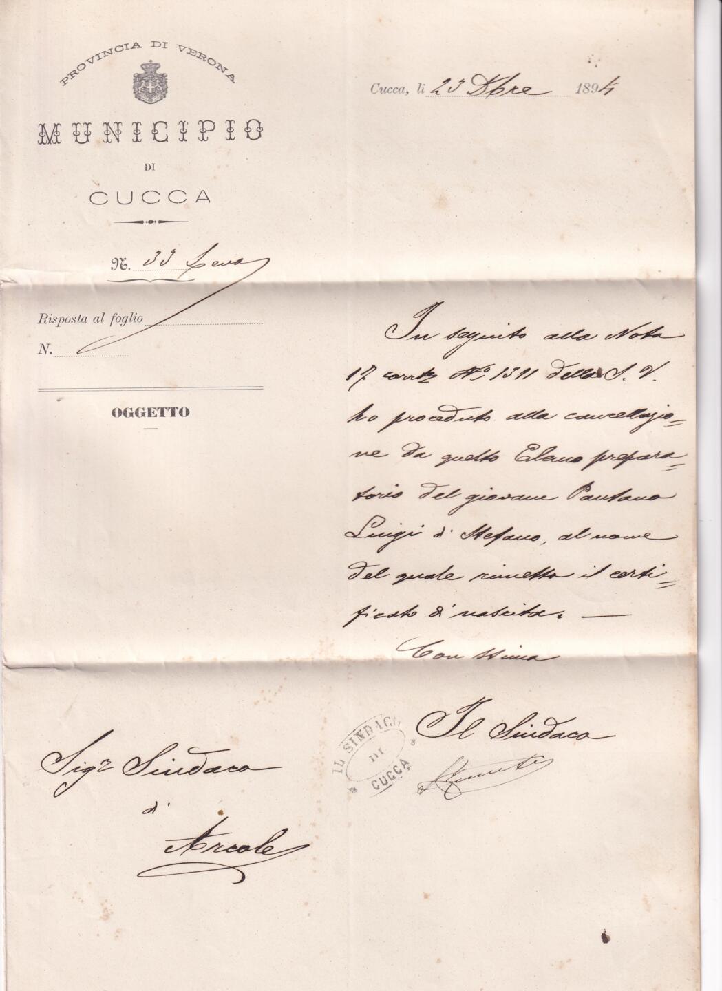 Storia postale Circolare da Municipio Cucca (Timbro R. Poste Sindaco del Comune di Cucca) 30/12/1894 al Sig. Sindaco di Arcore