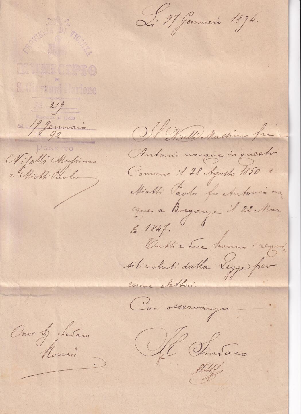 Storia postale Circolare da Municipio di S. Giovanni Ilarione 27/01/1894 all’Onor. Sig. Sindaco di Roncà 28/01/1894