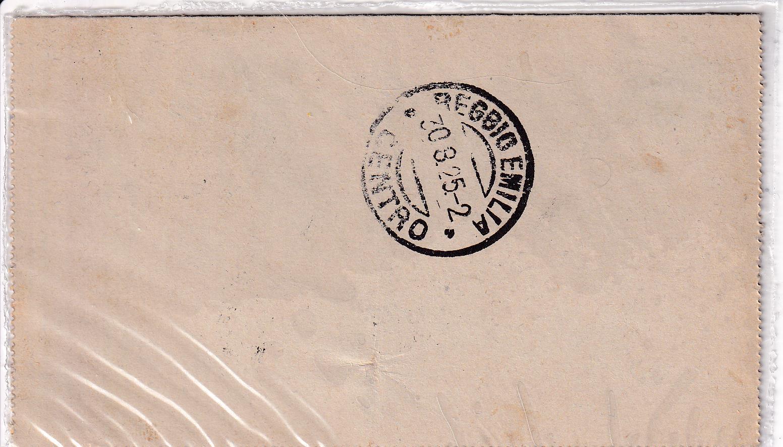 Storia postale. Biglietto postale da Bergamo 29/08/1925 a Reggio Emilia 30/08/1925
