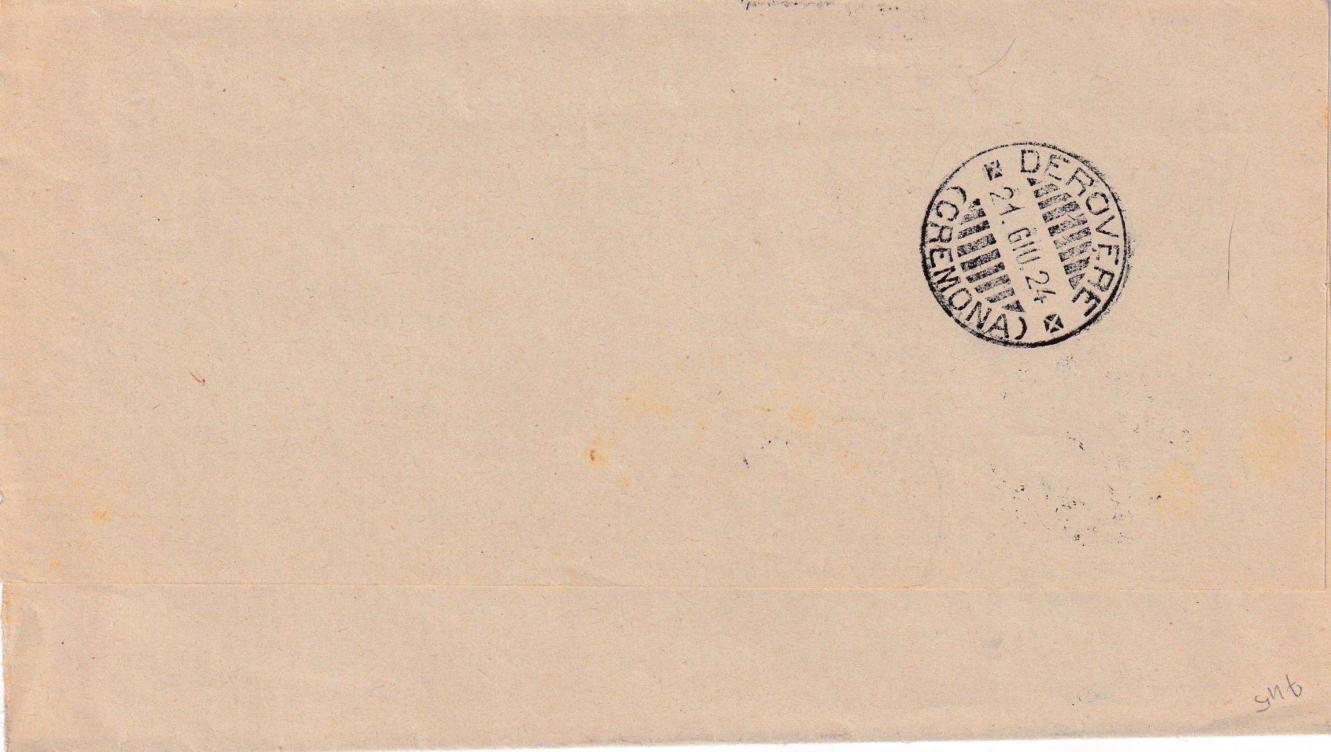 Storia postale Piego viaggiato Istituto di Previdenza Sociale per le Provincie di Cremona e Mantova Sede di Cremona 20/06/1924 all’Ill.mo Sig. Sindaco di Derovere (Cremona)