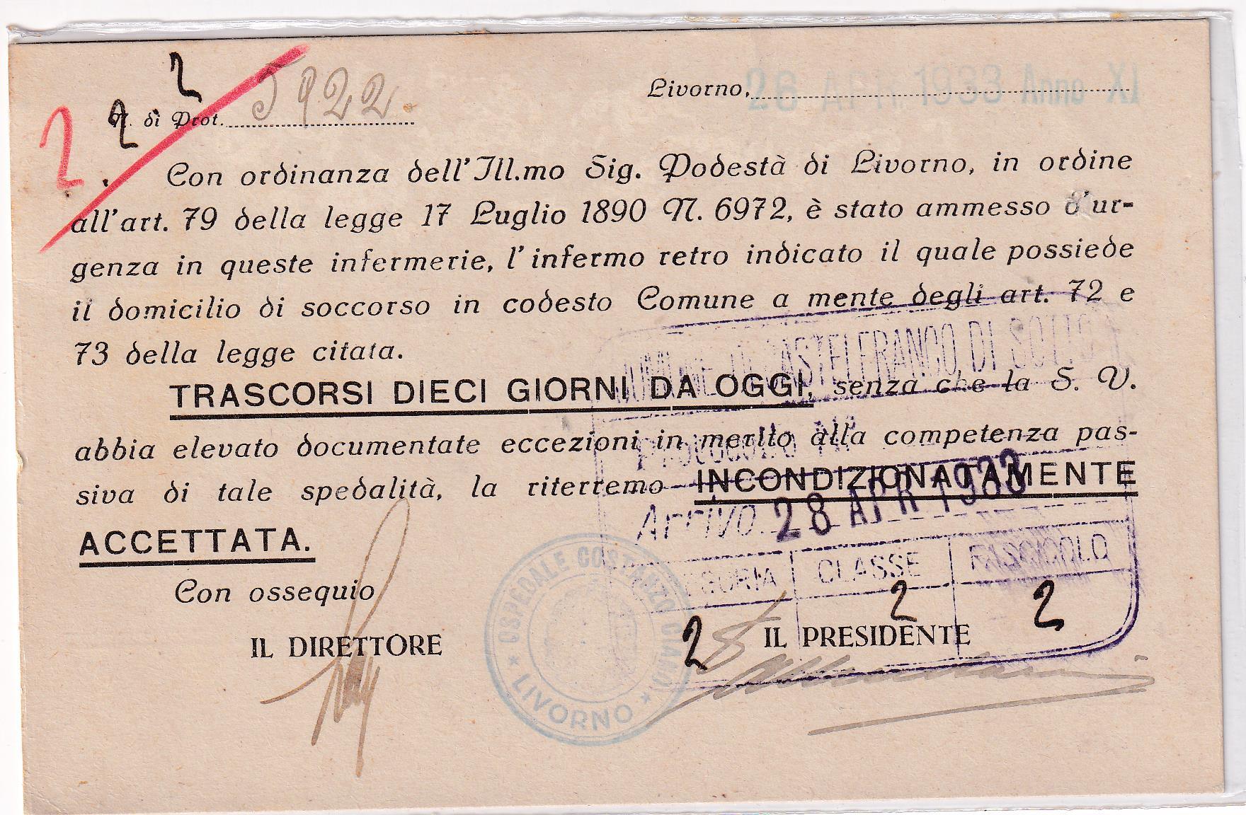 Storia postale, Cartolina Raccomandata da Livorno (N 8) R 1567 del 27/04/1933 a Castelfranco di Sotto 28/04/1933