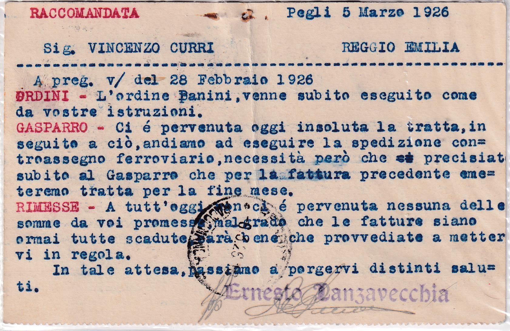 Storia postale, Cartolina Raccomandata da Pegli 453 del 05/03/1926 a Reggio Emilia 8/03/1926