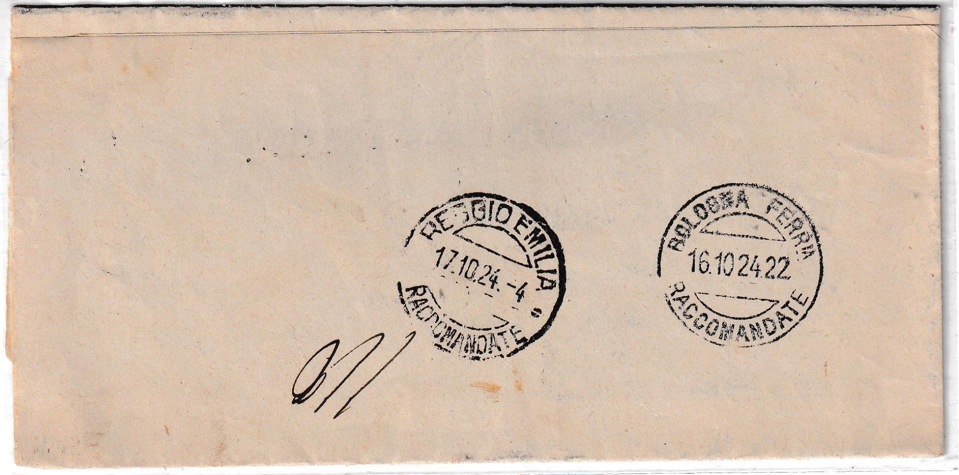 Storia postale, Piego Raccomandato da Bologna 4173 del 15/10/1924 a Reggio Emilia 17/10/1924