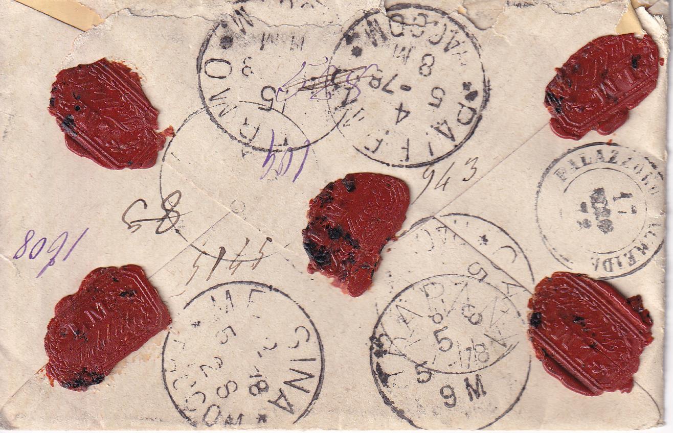 Storia postale Raccomandata da Reggio Calabria R 101 02/05/1878 a Piazza Armerina
