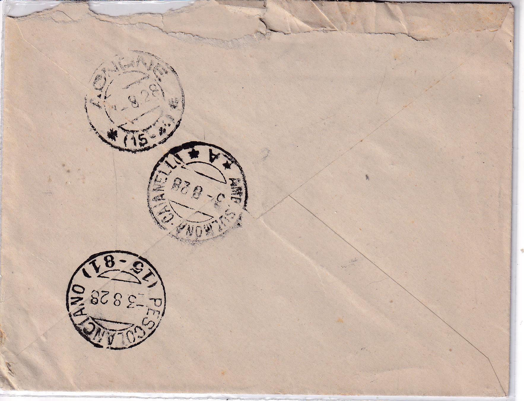 Storia postale. Raccomandata da Ateleta R 3287 del 02/08/1928 a Agnone 03/08/1928