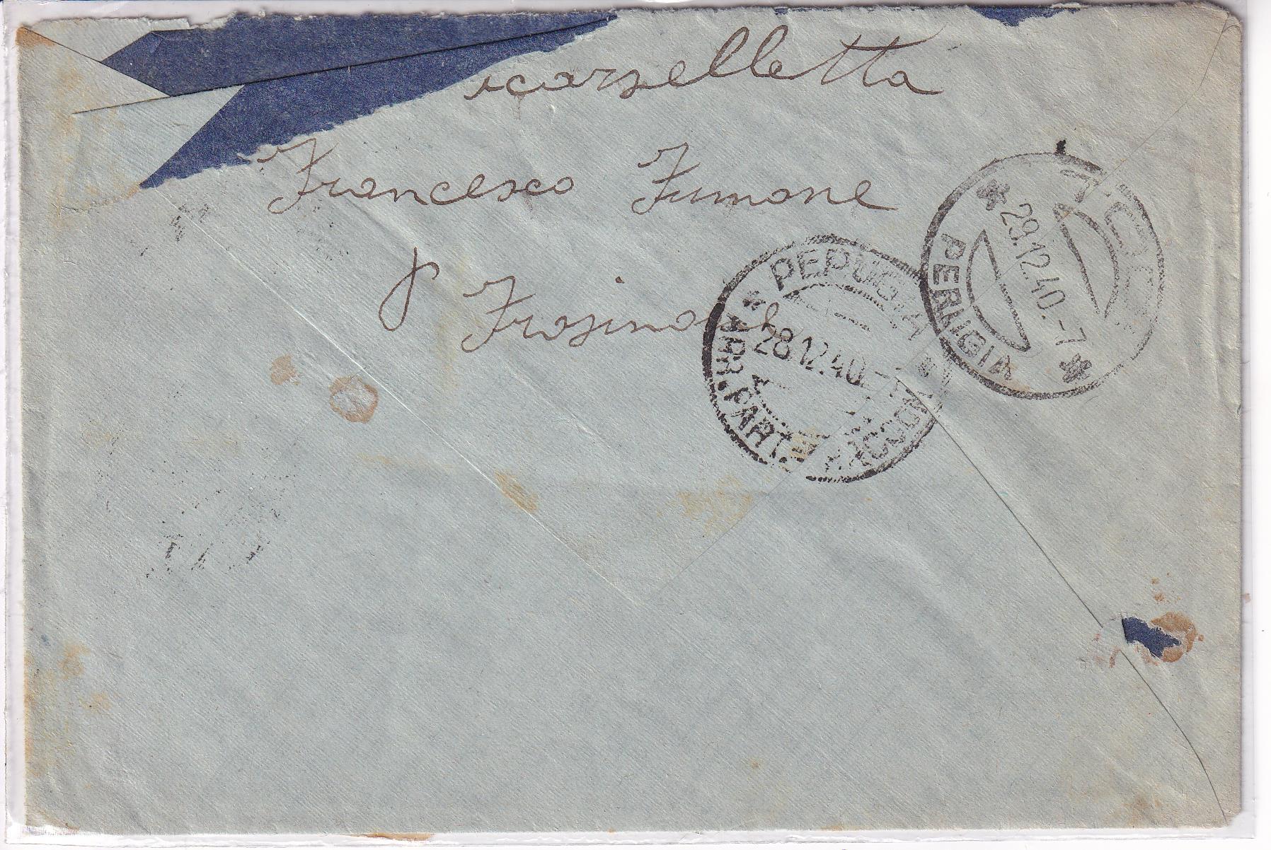 Storia postale. Raccomandata da Alatri R 873 del 27/12/1940 a Perugia 28/12/1940