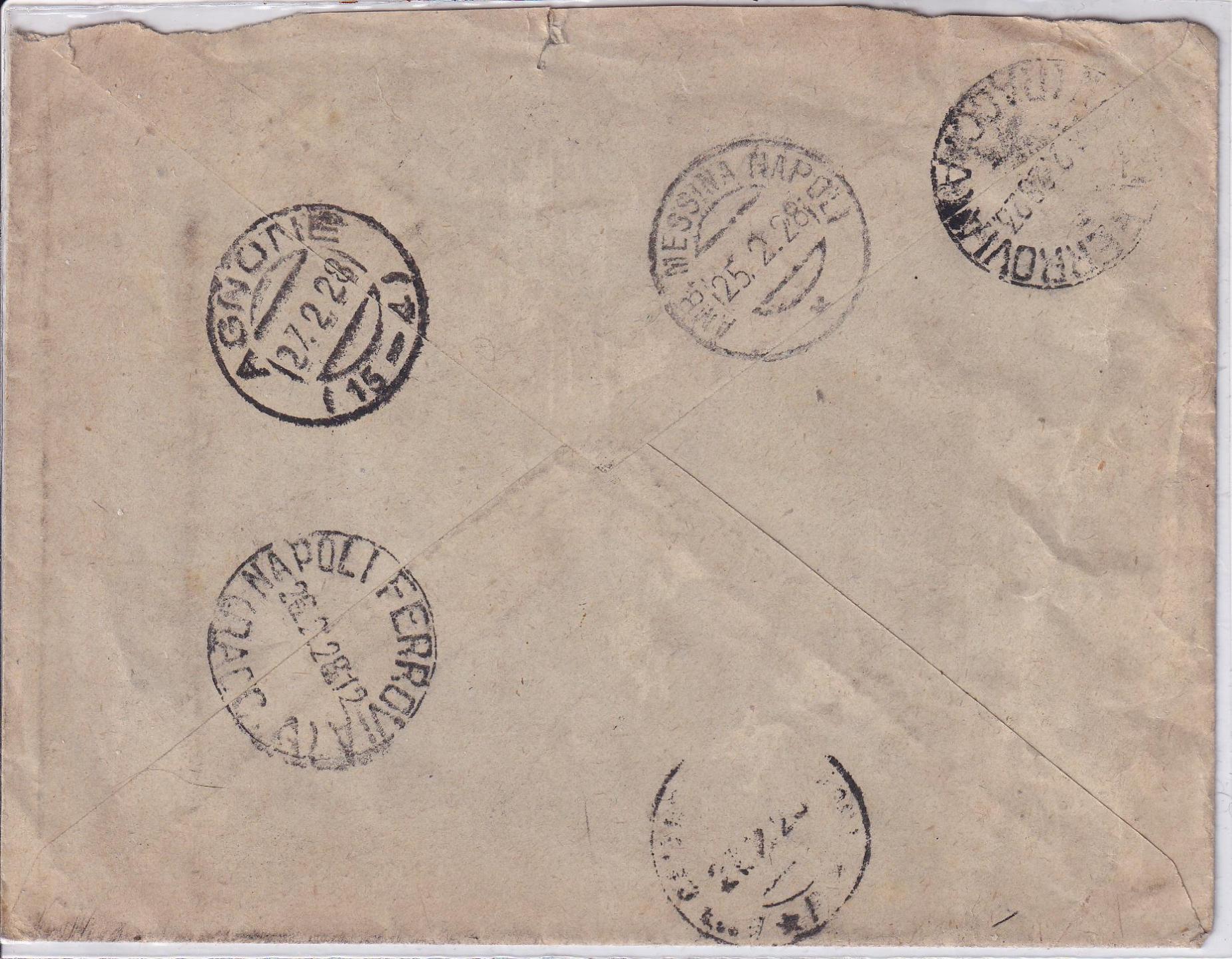 Storia postale. Raccomandata da Giarre R 763 del 25/02/1928 a Agnone 27/02/1928