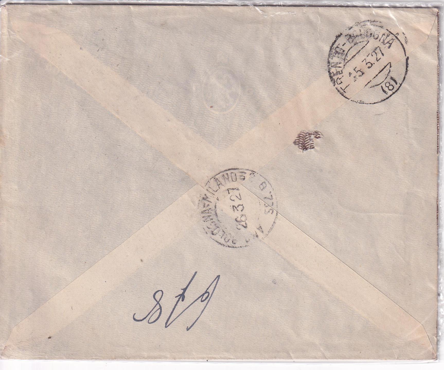 Storia postale. Raccomandata da Mantova 857 del 25/03/1927 a Reggio Emilia – Bologna/Milano 26/3/27