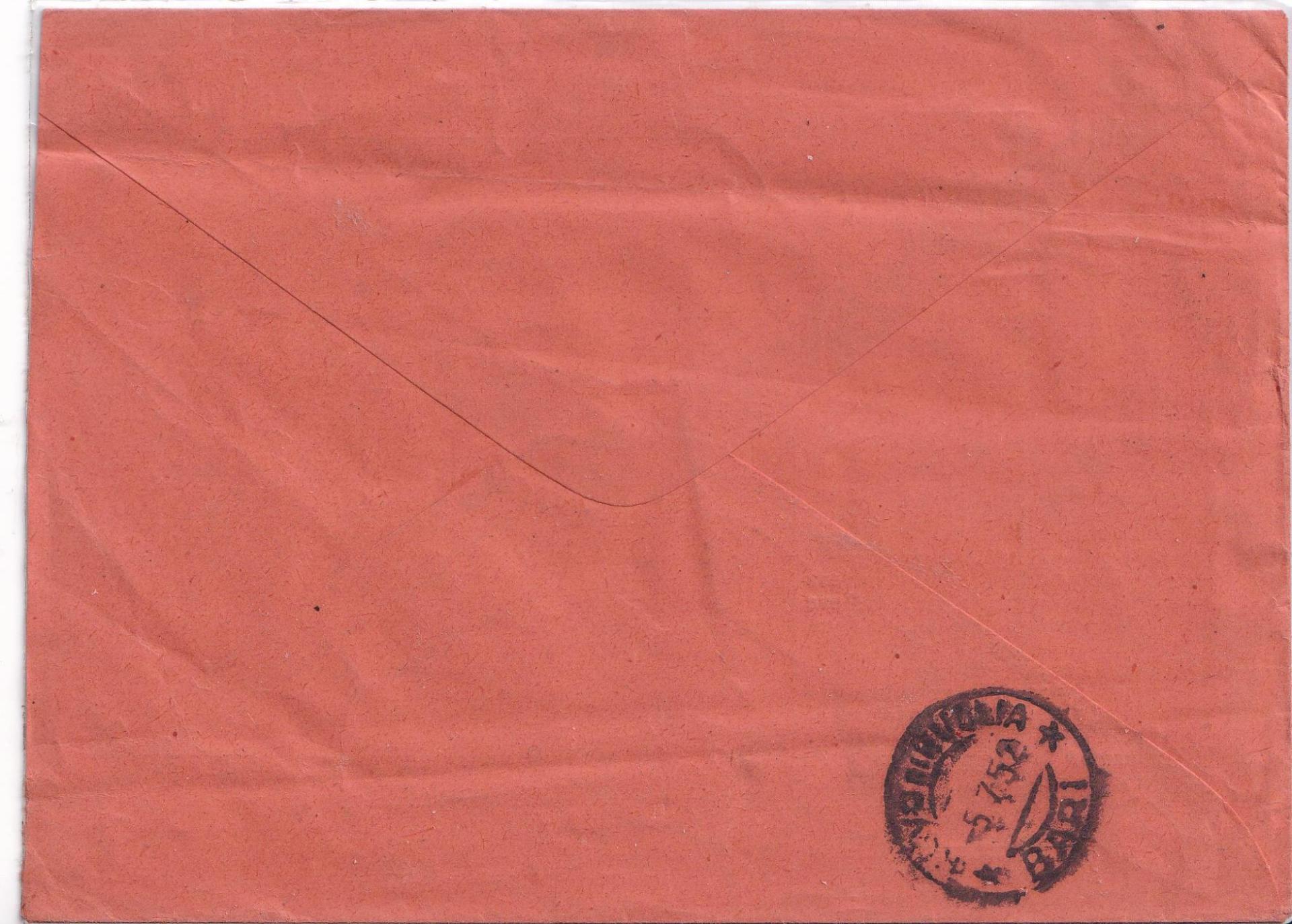 Storia postale. Atti Giudiziari. Raccomandata da Bari R 0475 04/07/1952 a Ruvo di Puglia 04/07/21952