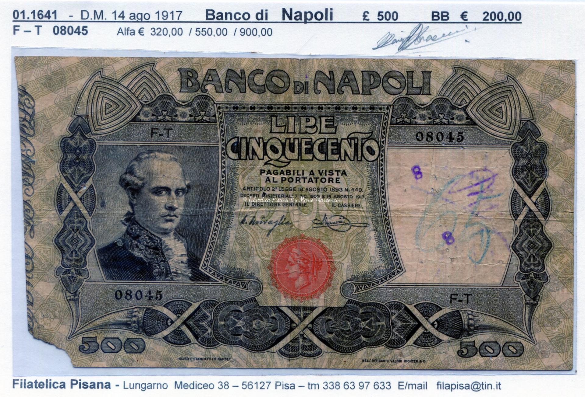 Banco di Napoli  14 agosto 1917   F-T 08045  £ire  500    BB