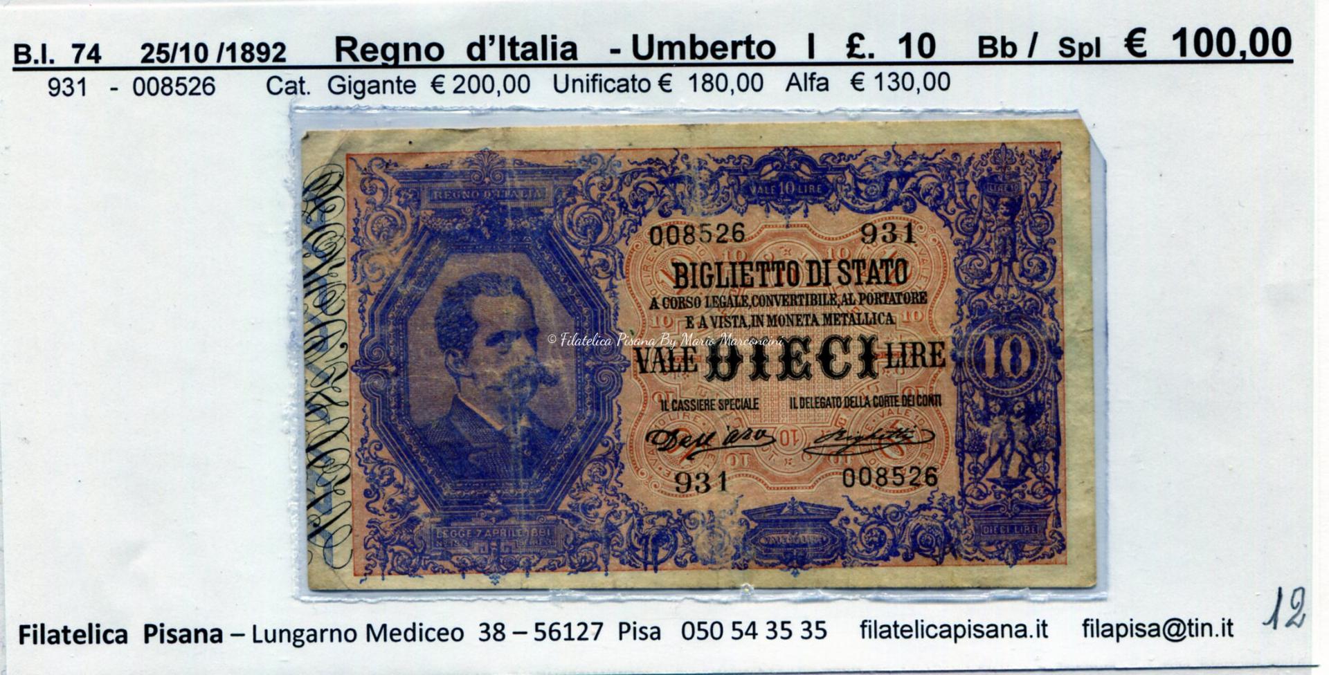 2 Regno d’Italia 1892 Umberto Primo £ 10