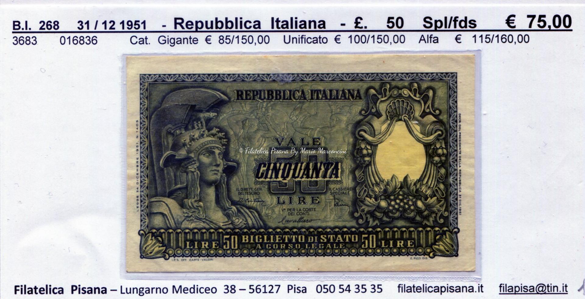 Banconota   BS  268   Repubblica  Italiana    31 / 12 / 1951   £  50   serie   3683 – . 016836    Spl /  Fds