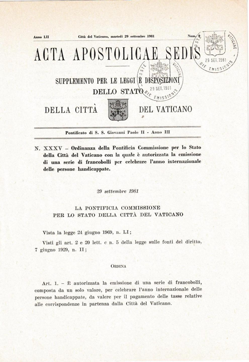 Emissione Francobollo celebrativo dell’Anno internazionale delle persone handicappate