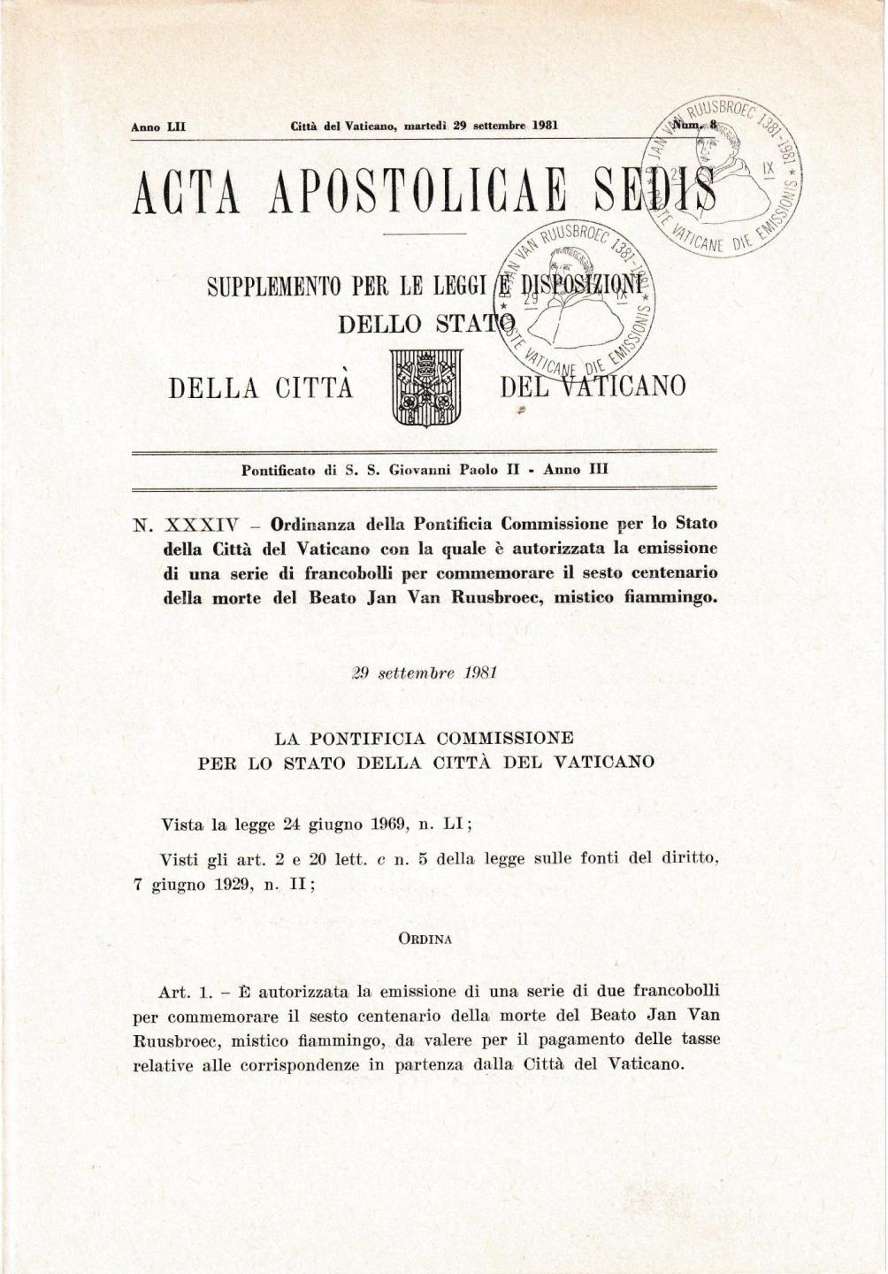 Sedis Emissione Serie Francobolli celebrativi del Centenario della morte del Beato Jan Van Ruusbroec