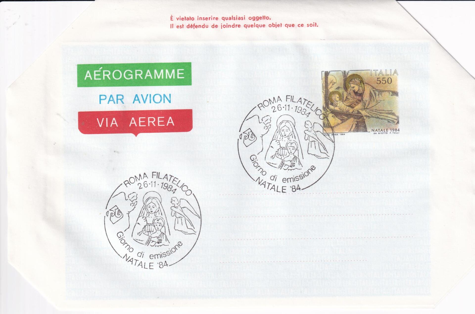 Aerogramma Italia Repubblica ANNULLO PRIMO GIORNO DI EMISSIONE (FDC) P 26/11/1984 Natale 84 Francobollo Natività di Giotto Lire 650 policromo (A 22)