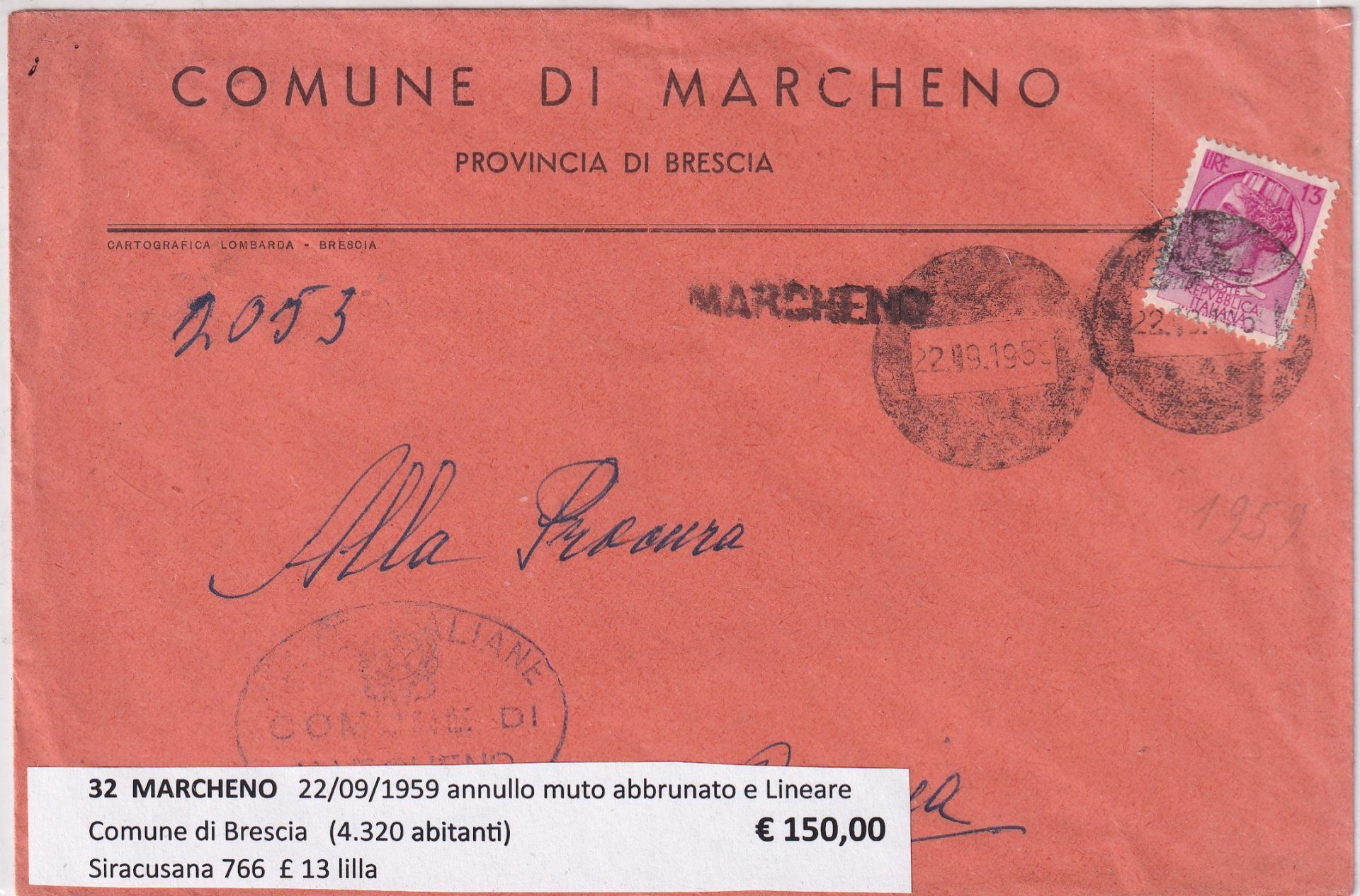 Annullo muto MARCHENO – Data 22/09/1959 Francobollo Siracusana (cat. n. 766) Lire 13 lilla
