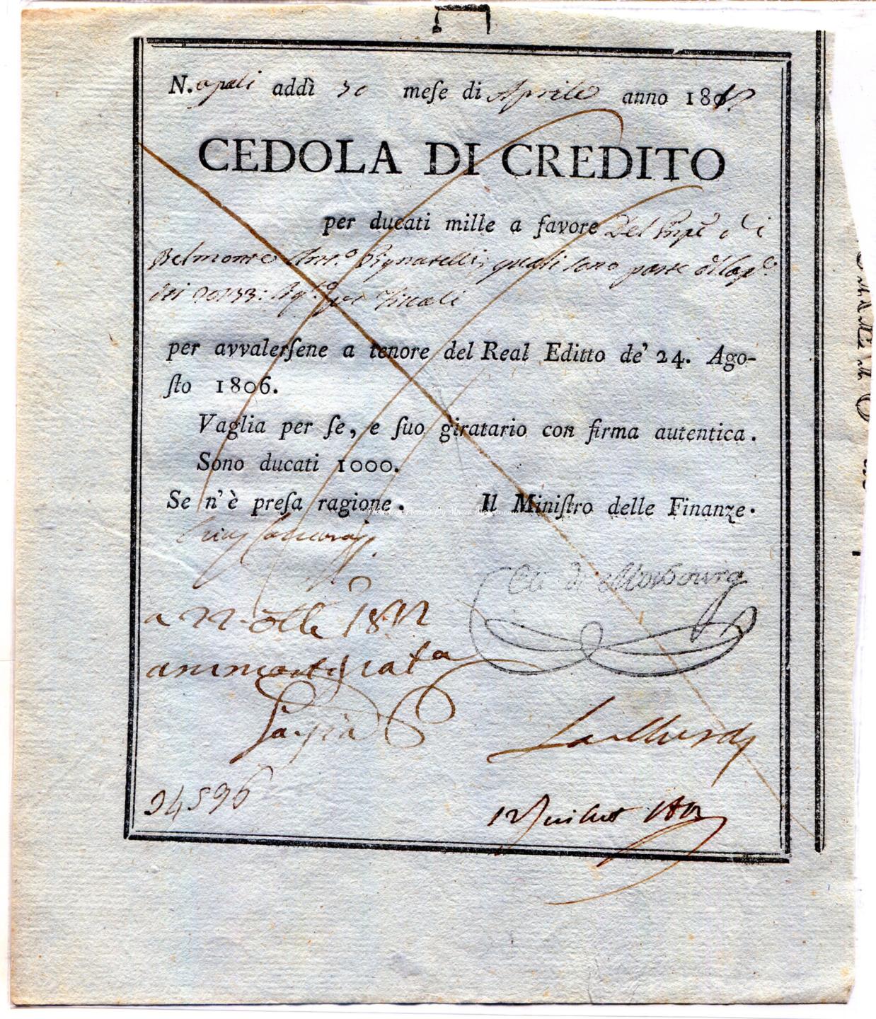 Antichi stati – Regno di Napoli Cedola Credito Napoleonico Ducati 1.000