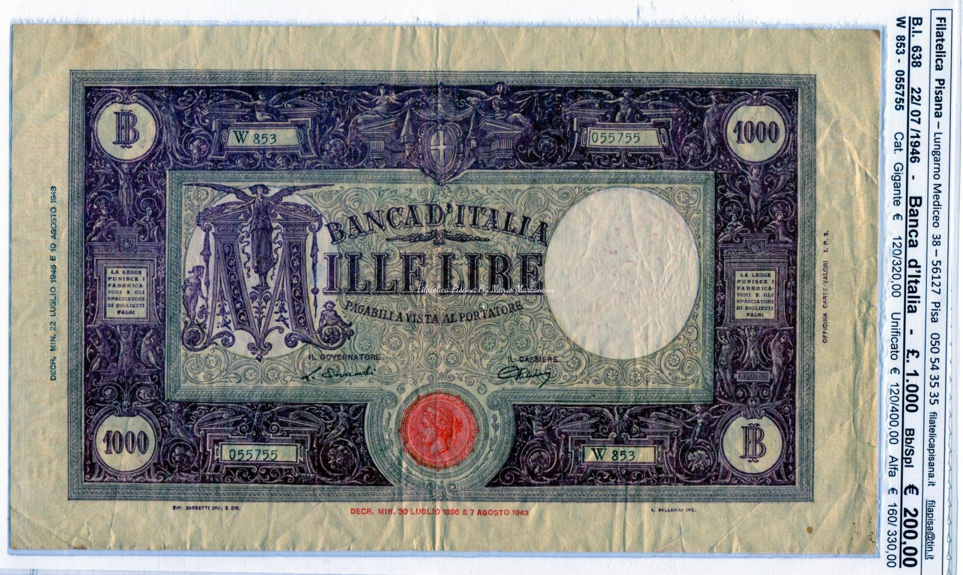 Banconota Banca d’Italia Regno d’Italia – Anno 1946 Lire 1.000
