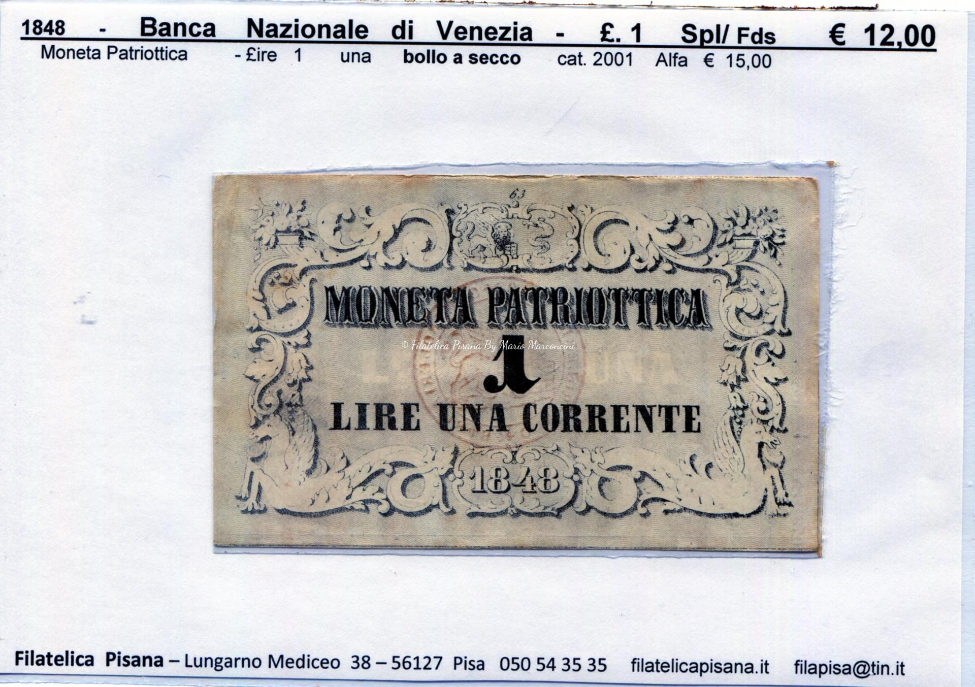 Banconota Banca Nazionale Venezia – Anno 1848 – moneta patriottica Lire 1