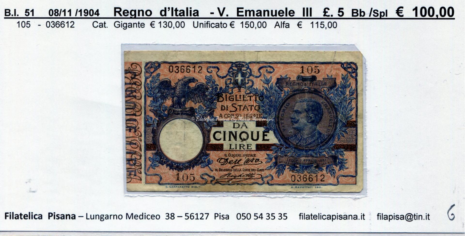 Biglietto di stato Regno d’Italia Vittorio Emanuele III – Anno 1904 Lire 5