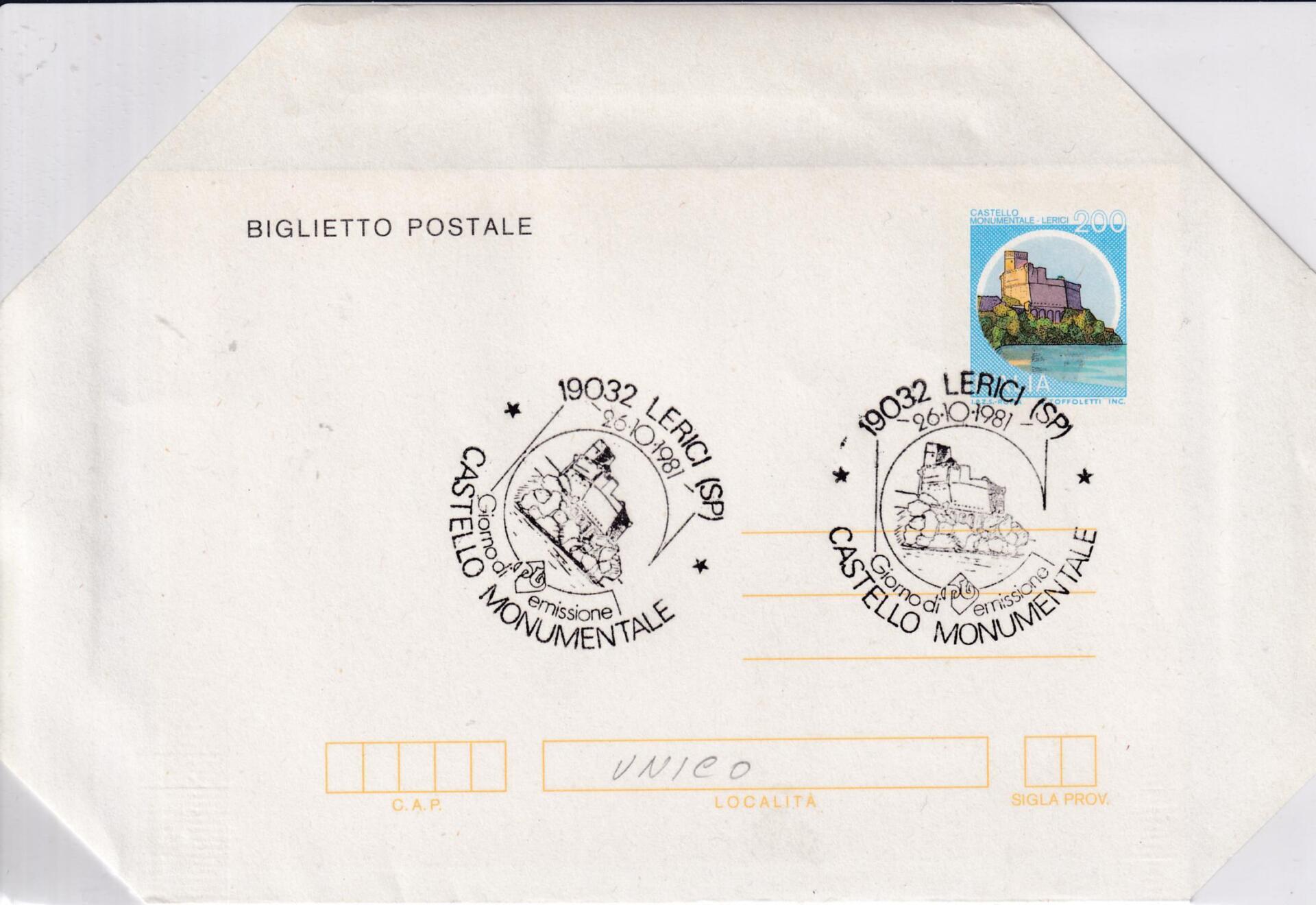 Biglietto Postale Italia Repubblica PRIMO GIORNO DI EMISSIONE (FDC) Annullo di Lerici 1981-1983 Castelli d’Italia Francobollo Veduta del Castello del Castello di Lerici Lire 200 (B 52)