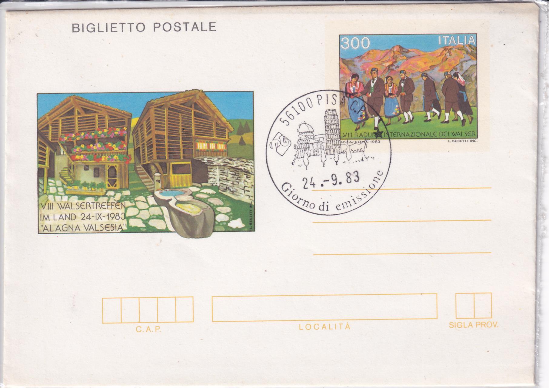 Biglietto Postale Italia Repubblica PRIMO GIORNO DI EMISSIONE (FDC) Annullo di Pisa 24/09/1983 Walser Ottavo raduno internazionale di Valsesia Francobollo Danzatori della Valsesia Lire 300 policromo (B 56)