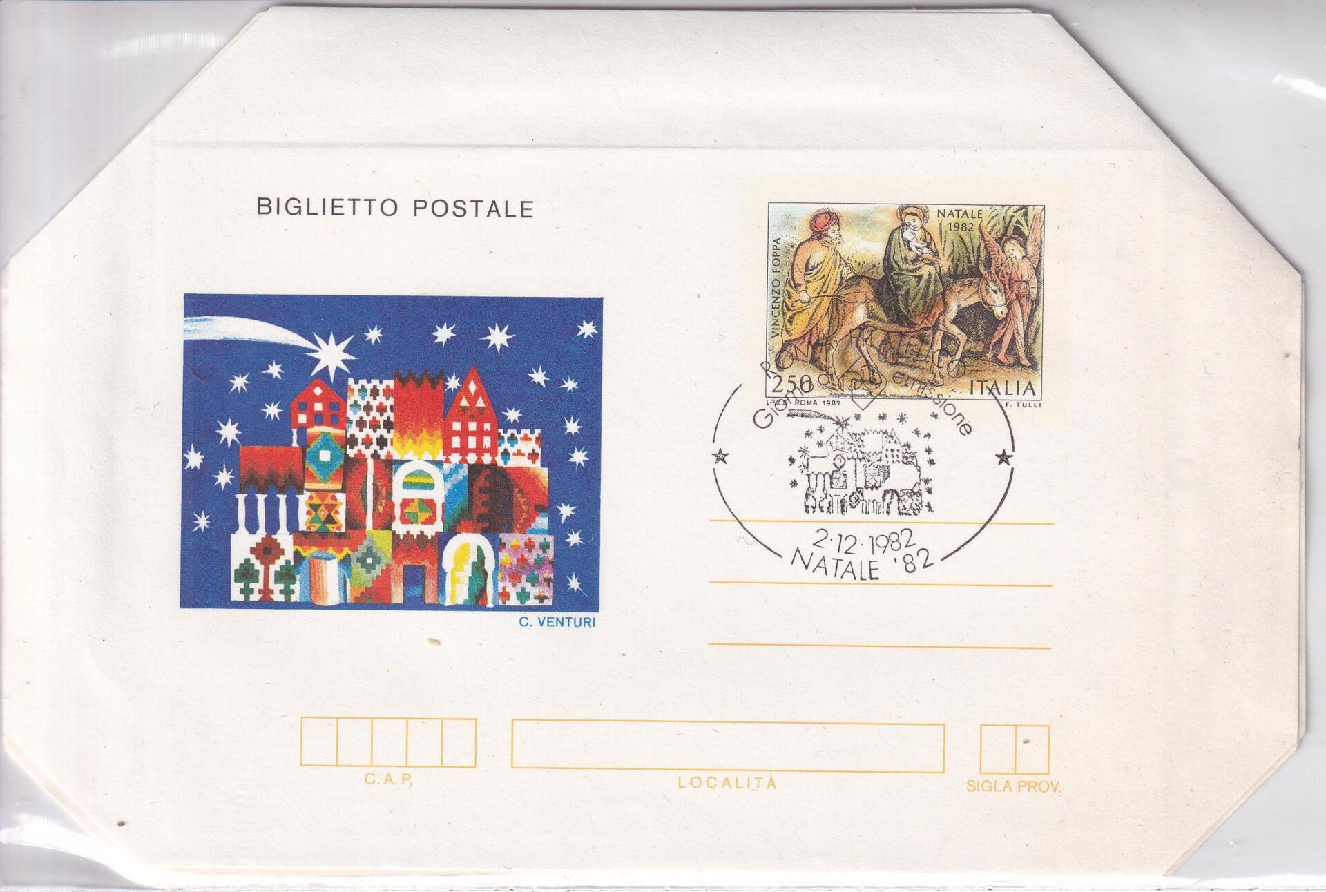 Biglietto Postale Italia Repubblica PRIMO GIORNO DI EMISSIONE (FDC) Annullo Roma Filatelico 02/12/1982 Natale 82 Francobollo Fuga in Egitto di Vincenzo Foppa Lire 250 policromo (B 55)