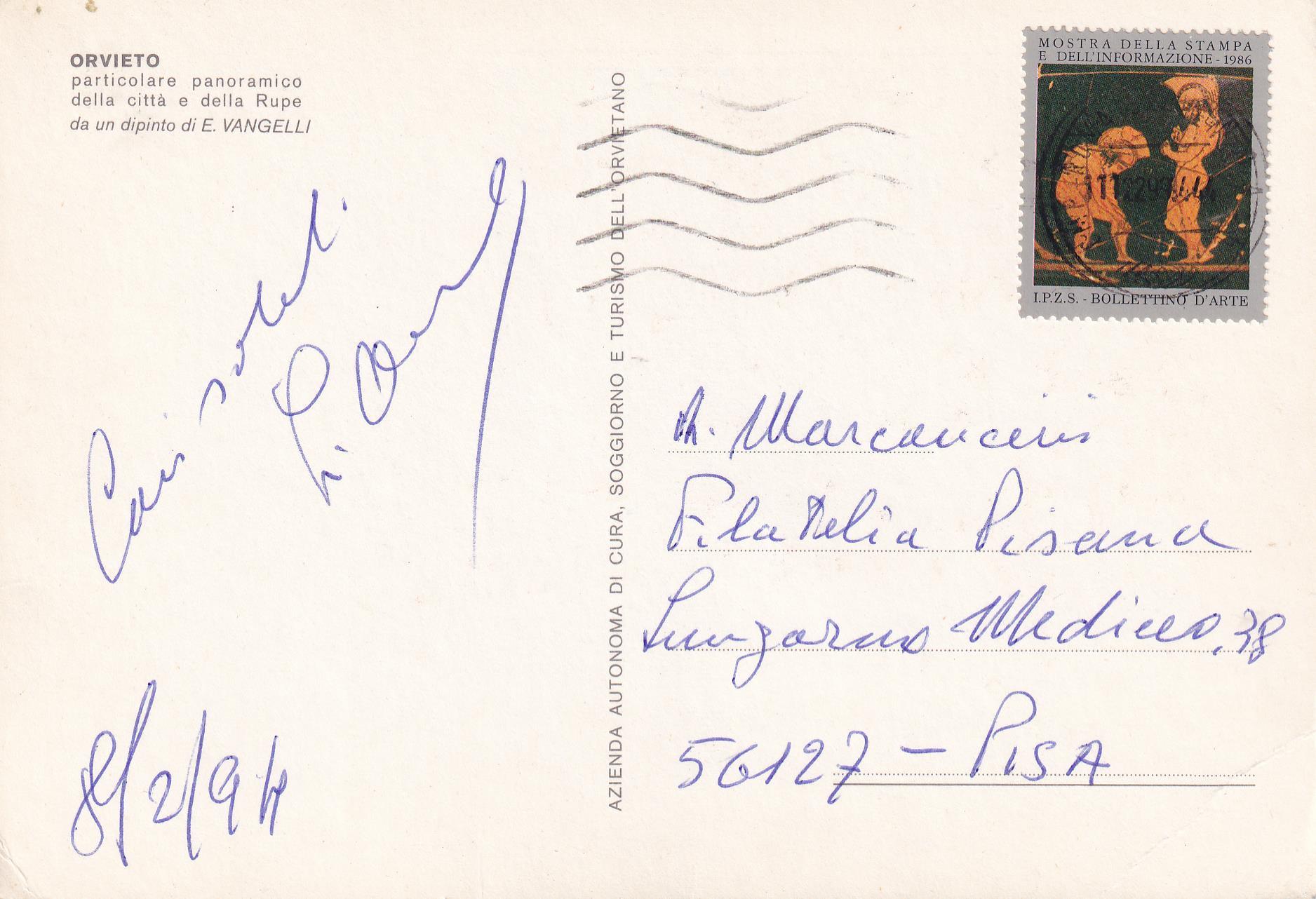 Cartolina di Orvieto affrancata con chiudilettera erinnofilo annullata e viaggiata